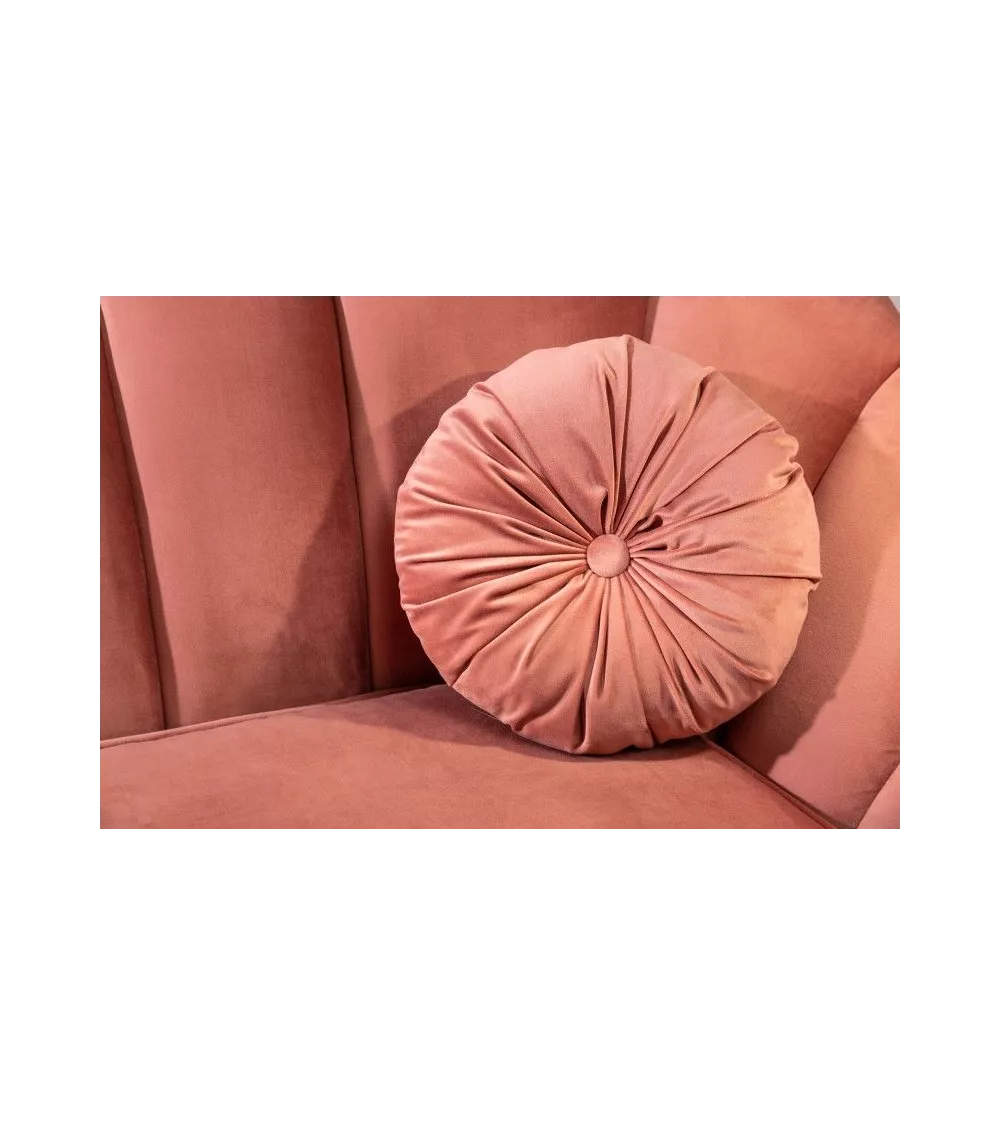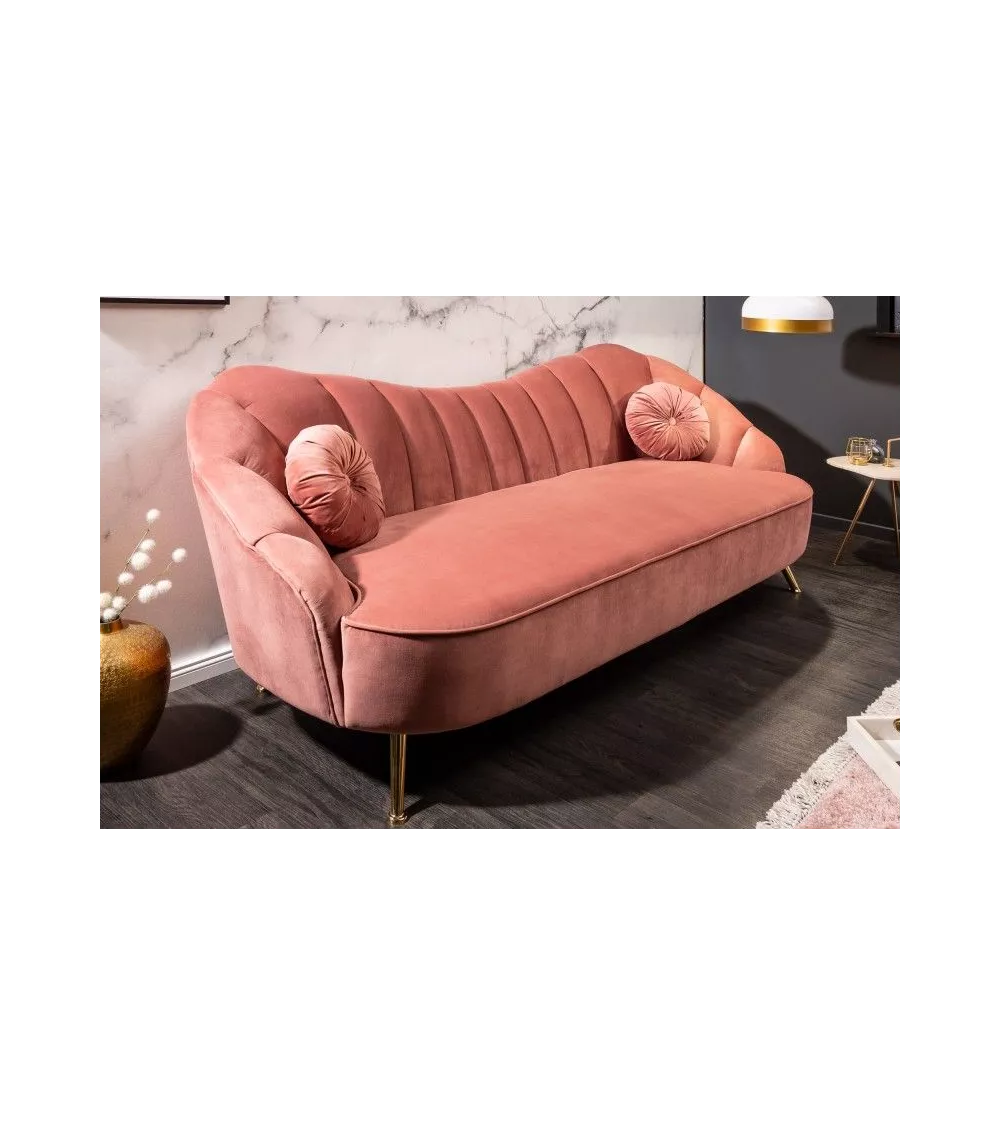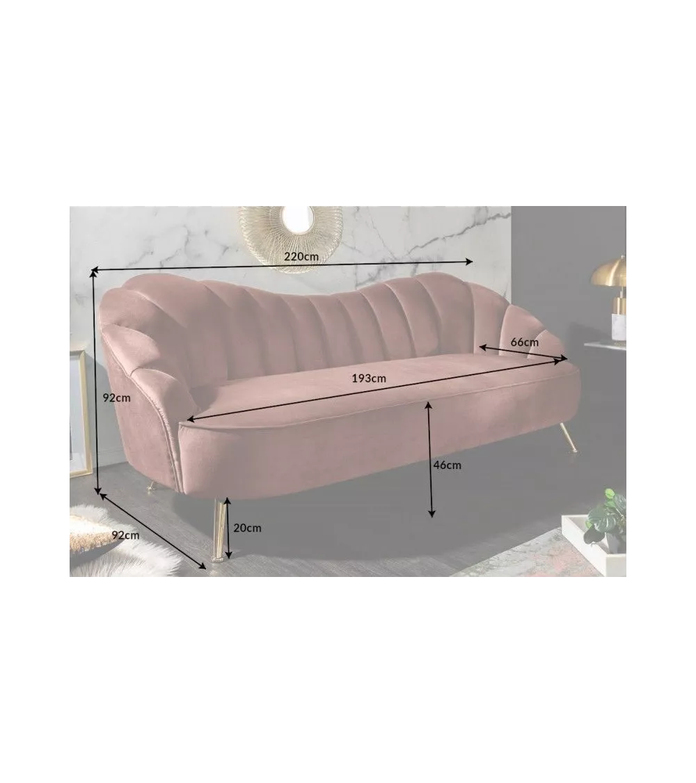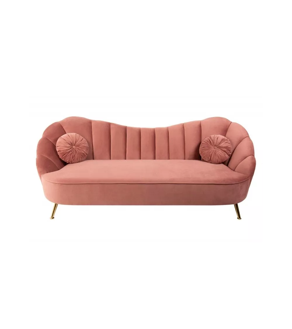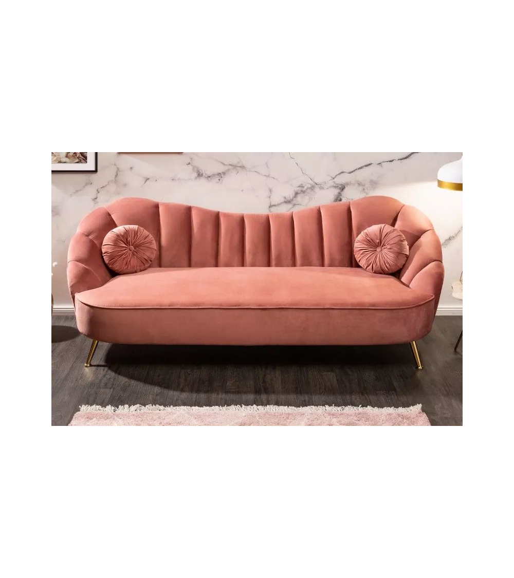 Un canapé trois places 220 cm Arielle original tout en rondeur. Sa forme incurvée et celle de ses coussins rappelle celle d’un coquillage. Vous apprécierez ses pieds évasés, qui lui donnent un certain caractère. Un canapé tout en velours, qui existe aussi dans d’autres coloris.