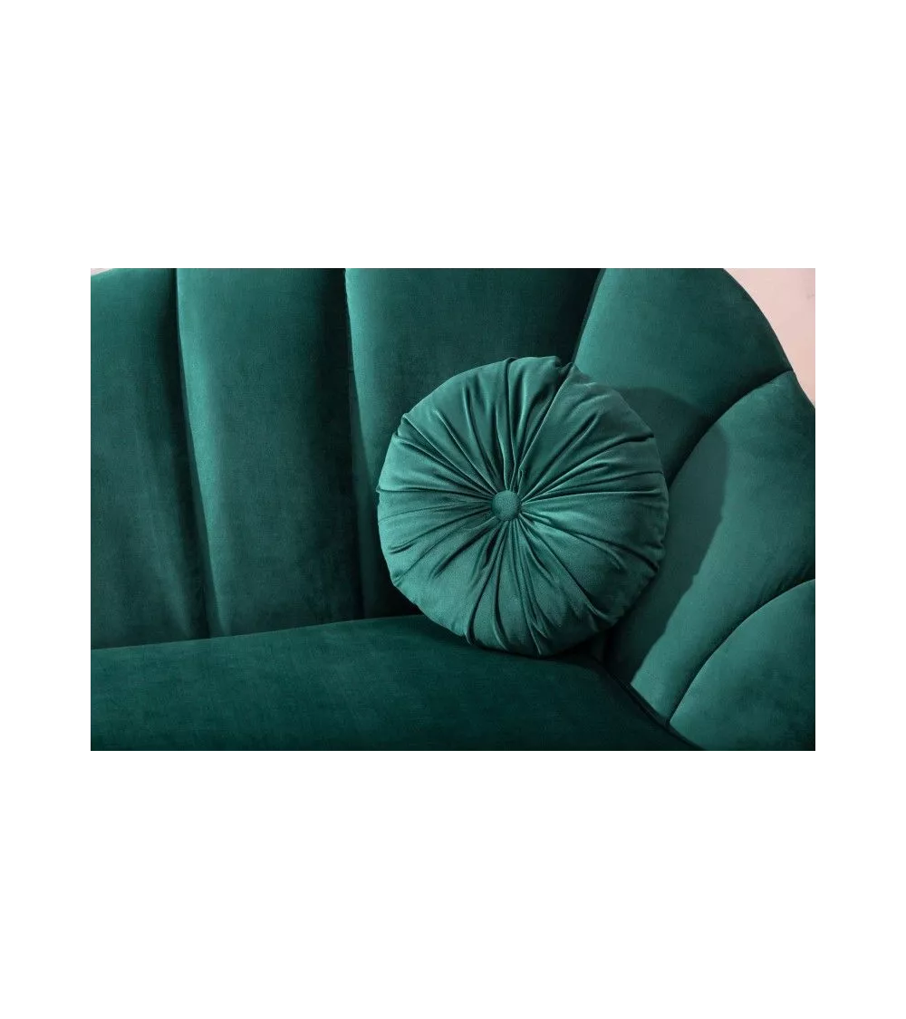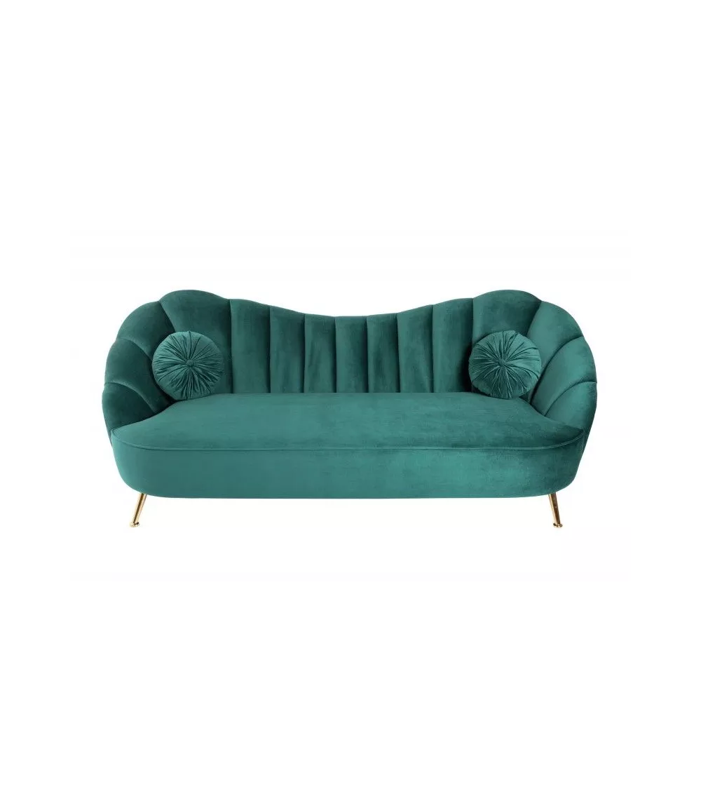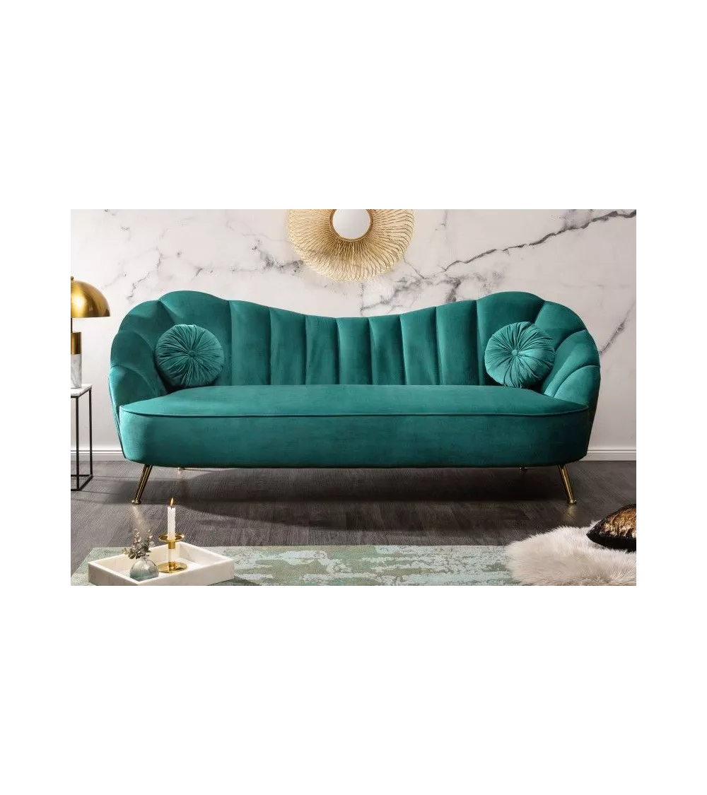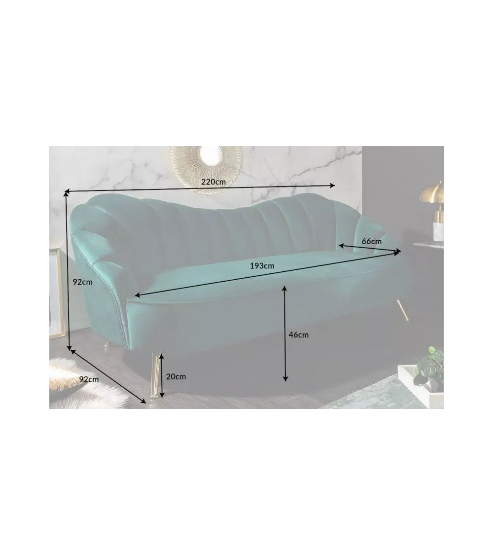 Un canapé trois places 220 cm Arielle original tout en rondeur. Sa forme incurvée et celle de ses coussins rappelle celle d’un coquillage. Vous apprécierez ses pieds évasés, qui lui donnent un certain caractère. Un canapé tout en velours, qui existe aussi dans d’autres coloris.