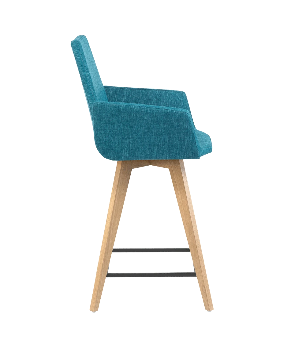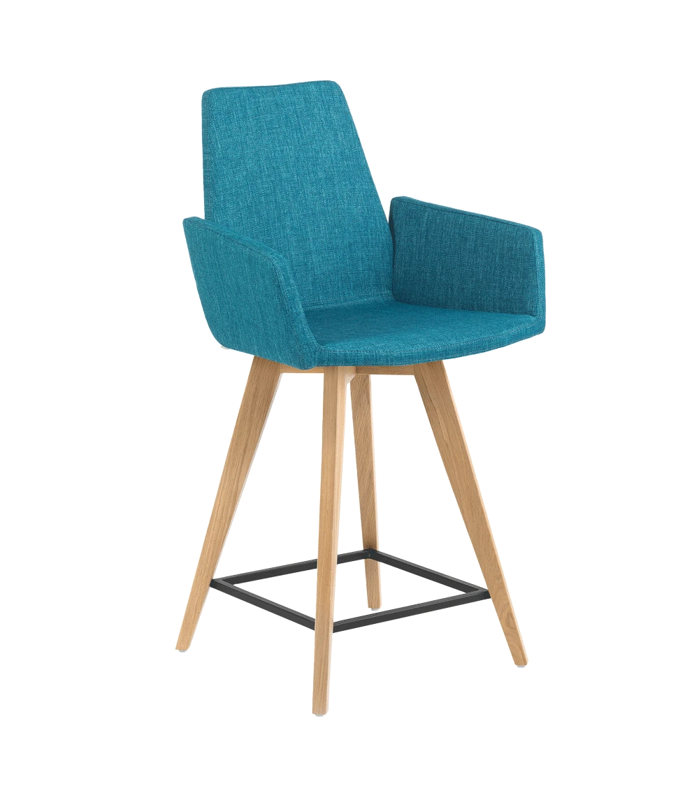 D’une hauteur de 62 cm, la version mi-haute de cette chaise permet de prendre place sur une table haute ou un bar de 90 cm. Elle est dotée d’accoudoirs intégrés directement dans la forme de la coque. Son piétement en bois issu de forêts gérées durablement est complété par un repose-pied métallique (noir).