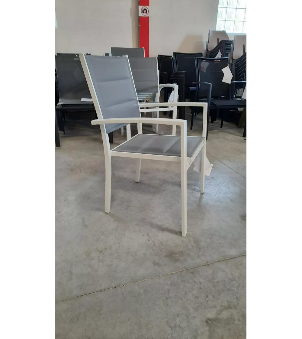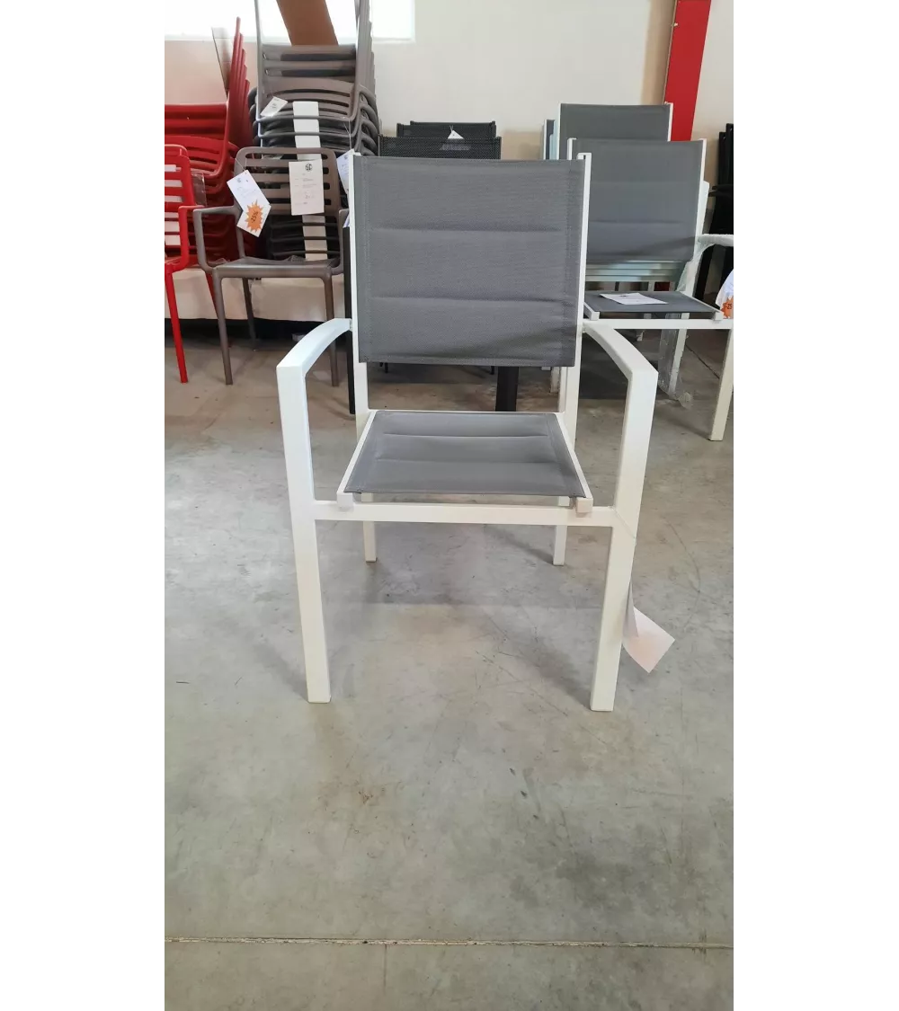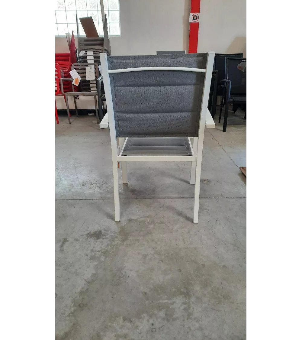 Fauteuil de jardin aluminium blanc et toile grise, son dossier est incliné et trés enveloppant .fauteuil empilable par 8 pièces.