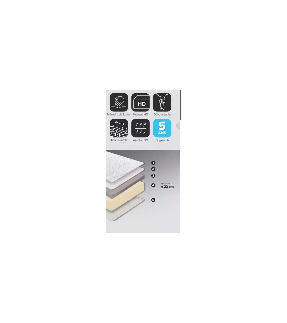 Viscomemory matelas à mémoire de forme d’une composition idéale pour soulager tous les points de pression du corps grâce à l’accueil enveloppant en mousse mémoire de forme et le soutien en mousse Haute Densité. Il est particulièrement bien adapté aux TPR et sa housse est déhoussable. Une base tissu 3D garantie une respirabilité optimale.