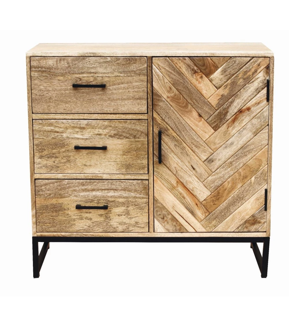 Un meuble avec 1 porte, 3 tiroirs et un piètement en acier laqué noir.
