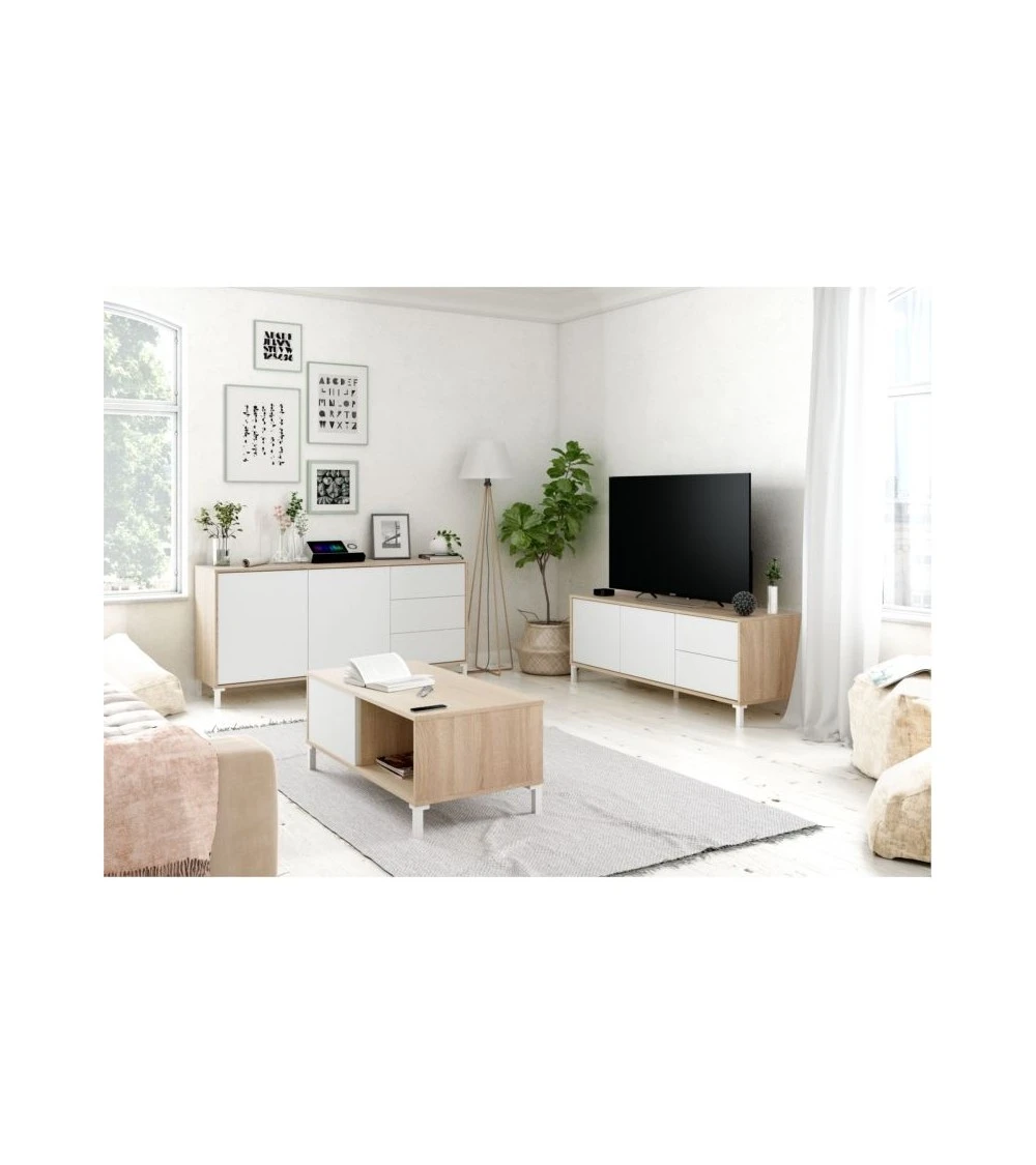Un design scandinave élégant pour ce meuble TV Fot aux finitions chêne et blanc. Vous profiterez de ses espaces de rangement : 2 tiroirs et 2 portes avec un système « push » pour une manipulation facile.