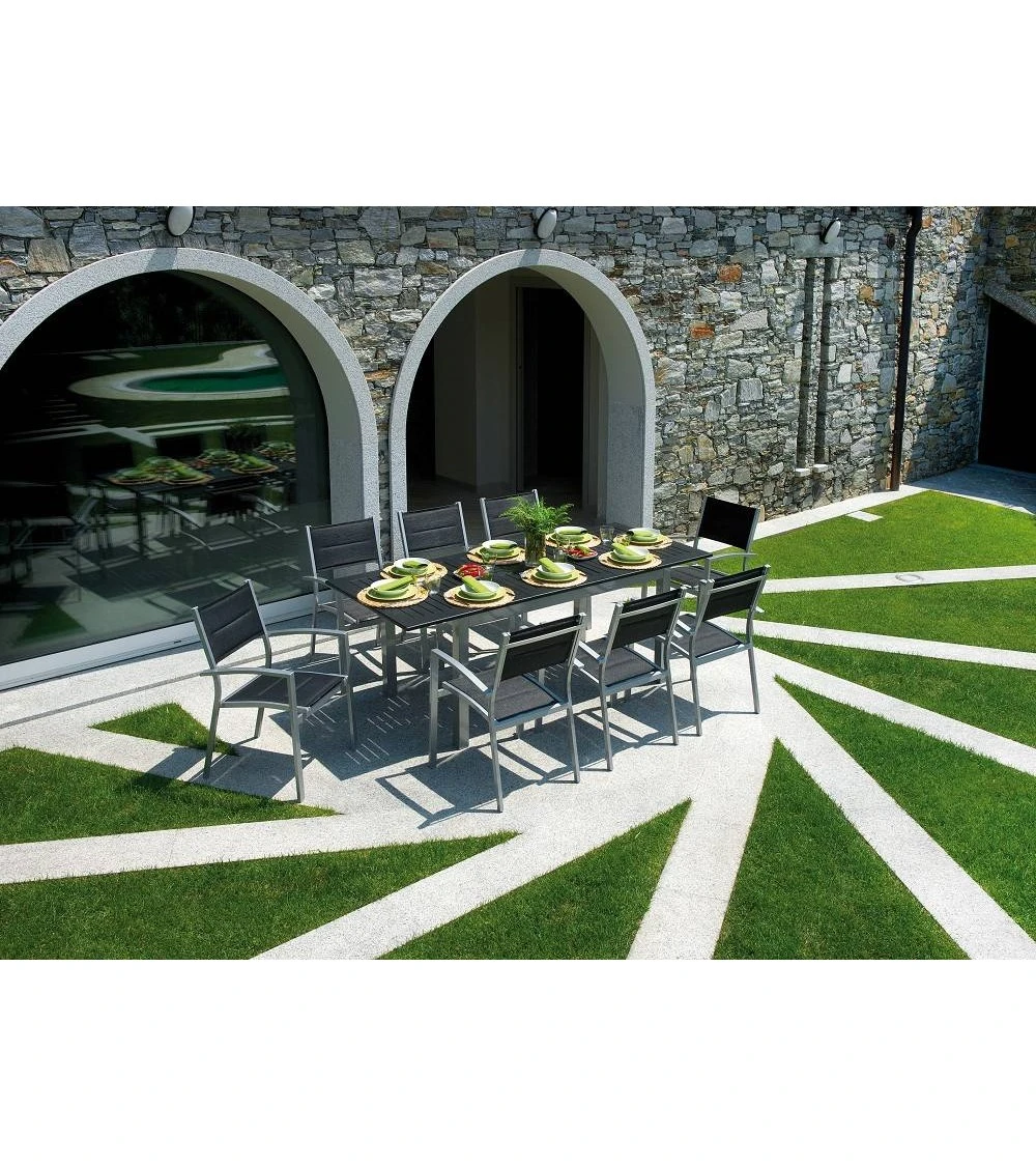 Table de jardin extensible structure et plateau en aluminium. Plateau noir et structure argent. a assortir avec le fauteuil amalfi.